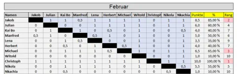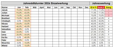 Blitzturnier 2026: •Gespielt wird ein Blitzturnier normalerweise am ersten Freitag im Monat (Ausnahmen: siehe Terminübersicht). • Beginn: 20:30 Uhr. • Bei weniger als sieben Teilnehmern wird doppelrundig gespielt. • Das Zeitformat sind 5 Minuten pro Spieler ohne Inkrement.• Das Gesamtergebnis ist der Durchschnitt aus den besten 8 Monatsergebnissen (in Prozent). Nicht-Teilnahme wird als 0% gewertet.