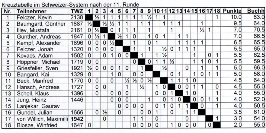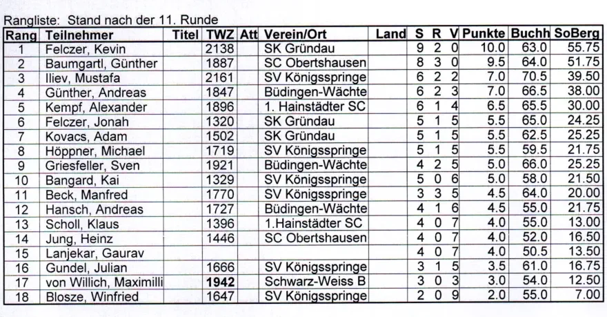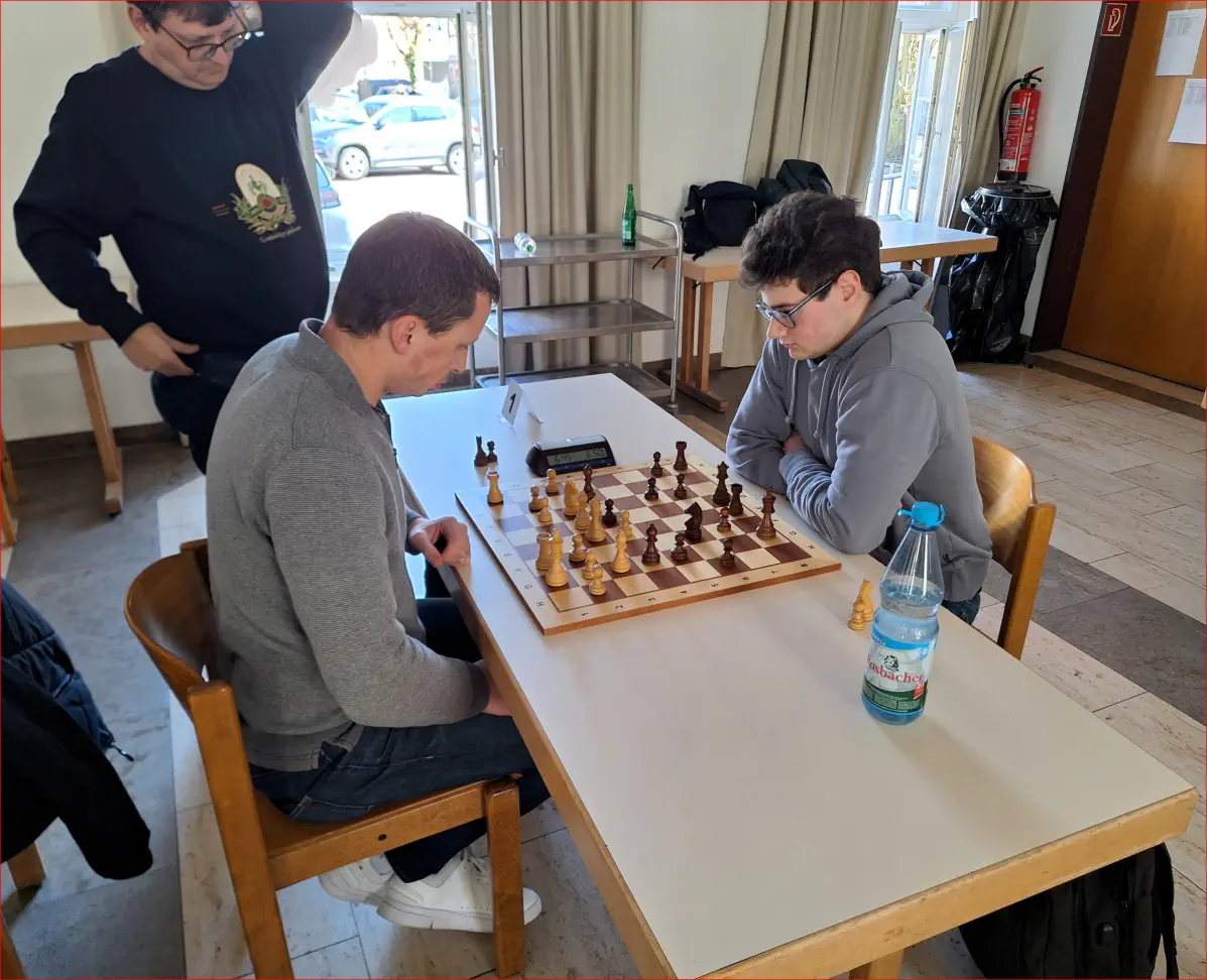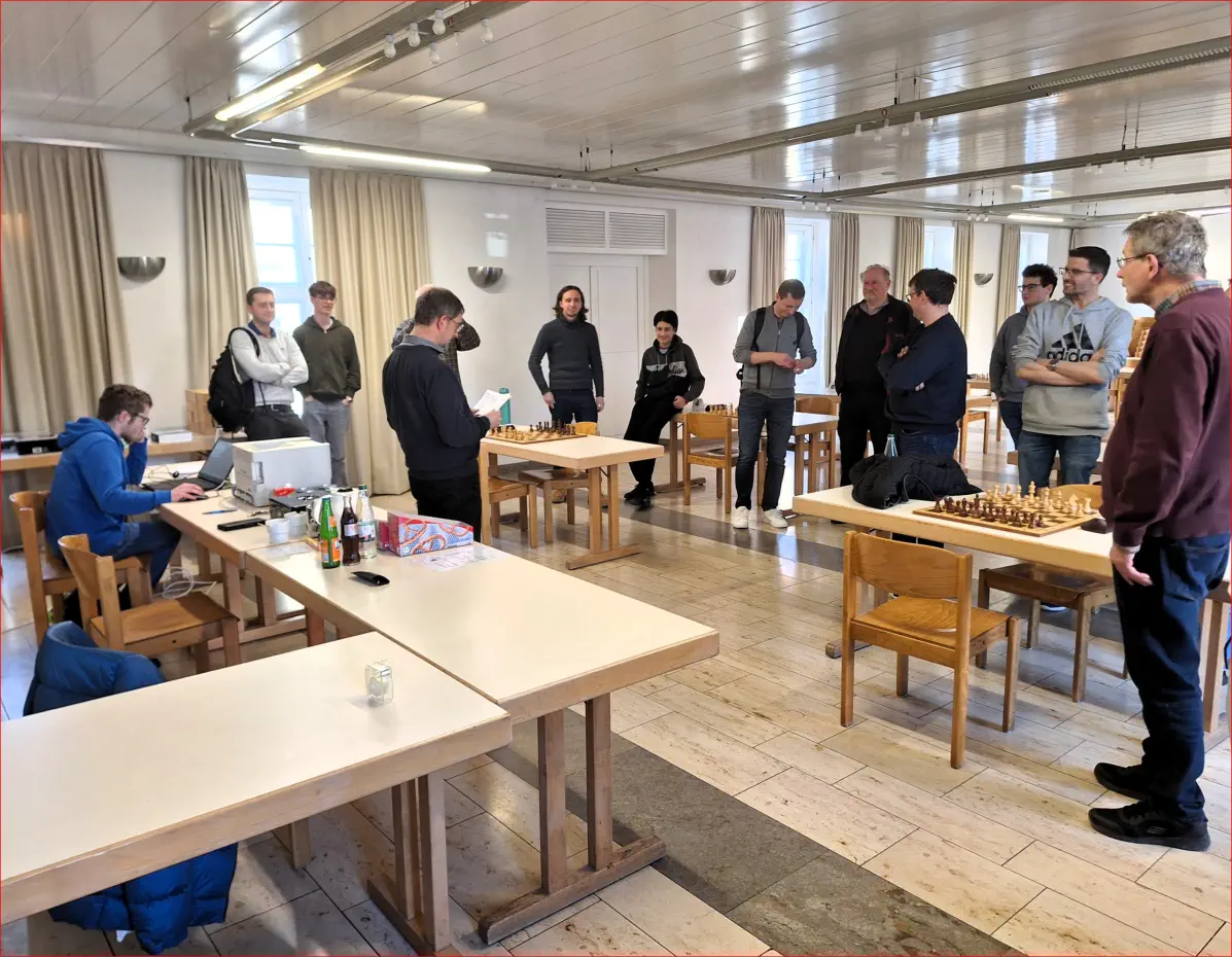In diesem Jahr war unser Faschingsturnier leider nur von wenigen 18 Teilnehmern besucht.Der Sieg ging verdient an Kevin Felcer vom SK Gründau.Bester Großauheimer wurde trotz einem Spiel weniger Mustafa Iliev.Im Bild (von links):Dr. Boldt als Veranstalter, dann der Zweite Günther Baumgartl, dann Gewinner Kevin Felcer und Mustafa Iliev. Rechts Turnierleiter Jakob Dany.
