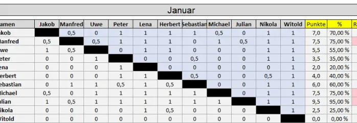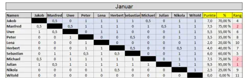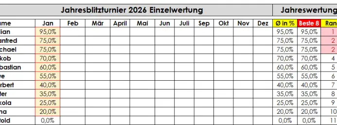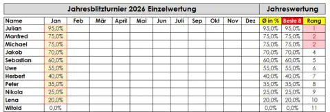 Blitzturnier 2026: •Gespielt wird ein Blitzturnier normalerweise am ersten Freitag im Monat (Ausnahmen: siehe Terminübersicht). • Beginn: 20:30 Uhr. • Bei weniger als sieben Teilnehmern wird doppelrundig gespielt. • Das Zeitformat sind 5 Minuten pro Spieler ohne Inkrement.• Das Gesamtergebnis ist der Durchschnitt aus den besten 8 Monatsergebnissen (in Prozent). Nicht-Teilnahme wird als 0% gewertet.