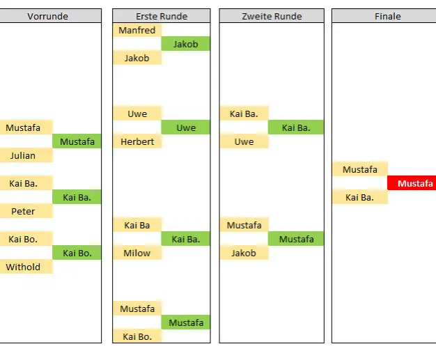 • Die Paarungen werden vor Beginn des Turniers ausgelost.